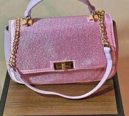 Het vaasje van 15 x 15 en 5,5cm. diep in de vorm van een zwarte handtas met gouden details is gevuld met een leuk boeketje met onder andere donker paarse tulpen πΈ
