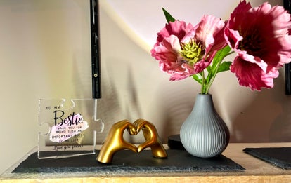 Het set bestaat uit een stenen plateau met daarop een wit vaasje met bloemen en een acryl Mini moment met daarop een mooie tekst!