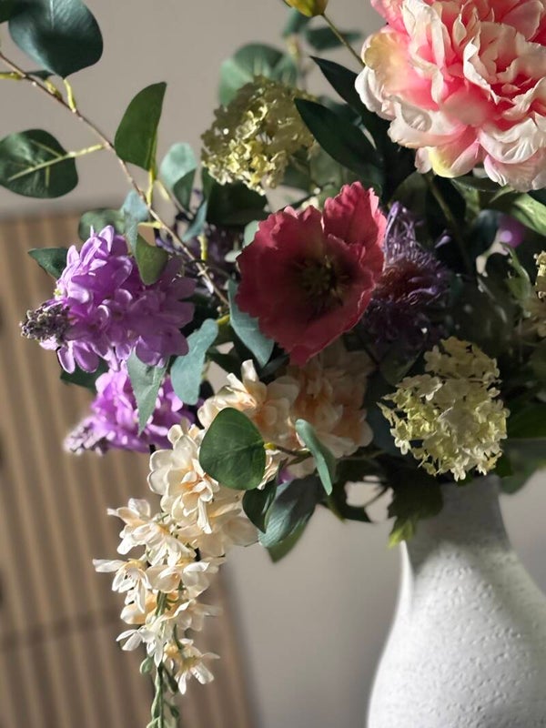 JOY is een echte eyecatcher! 👉Groot, vol met bloemen maar ook rustgevend door de neutrale lichte tinten! De grote zware witte vaas maakt het boeket compleet✨🌸