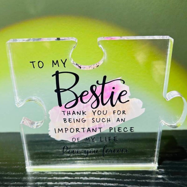 10 bij 10cm. standaard puzzel acryl 10 bij 8,5cm. Verkrijgbaar in verschillende varianten.