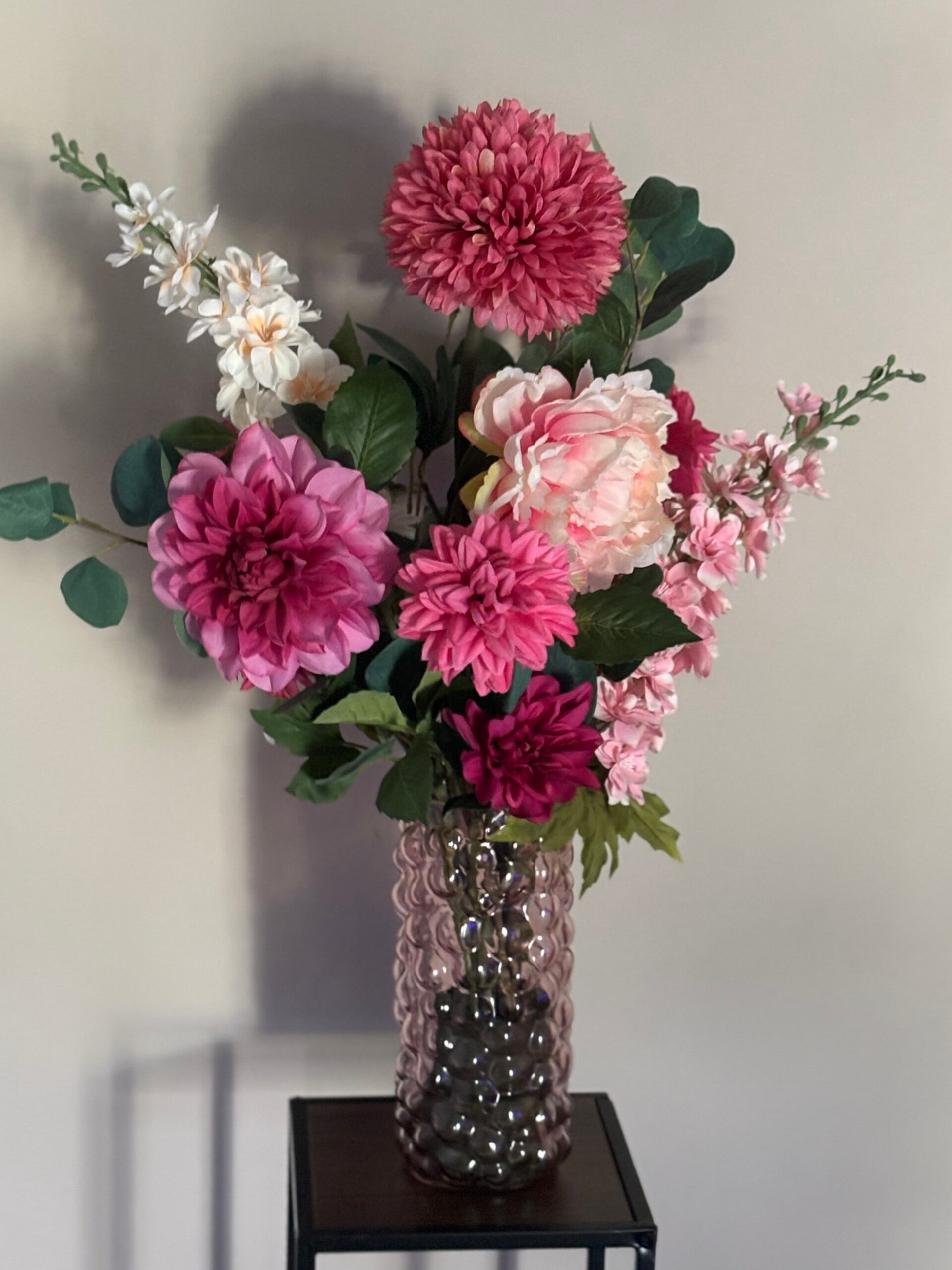 Breng kleur en elegantie in je interieur met dit prachtige roze kunstbloemenboeket in een luxe roze glazen vaas. ๐ธ