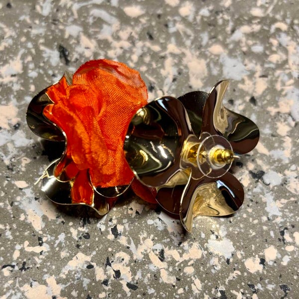 Hoe leuk zijn deze goudkleurige oorbellen gecombineerd met een oranje stofje..!?