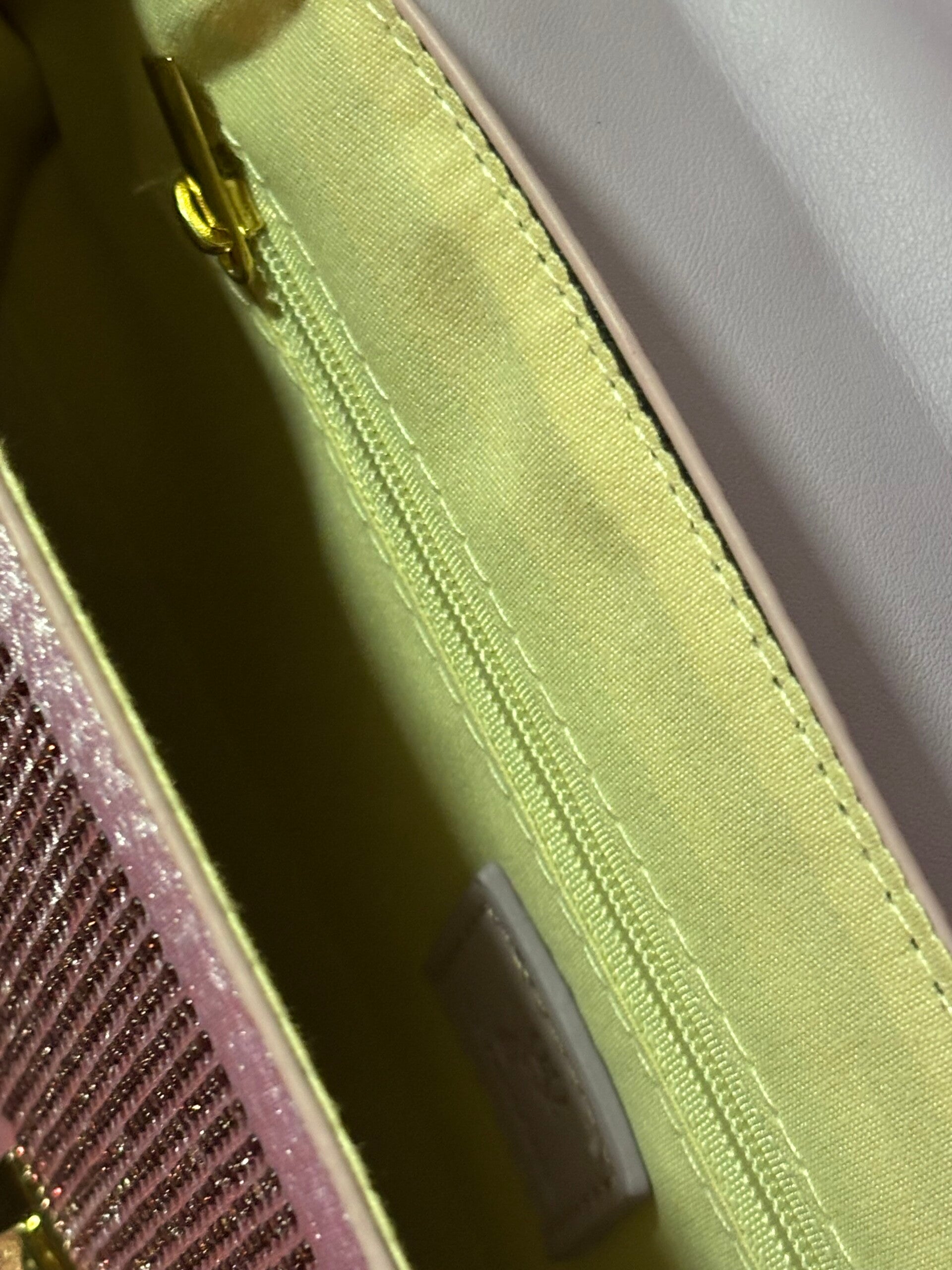 De tas is voorzien van een kort hengsel bovenop de tas en heeft ook een afneembaar lange schouderband. (Ketting chain)