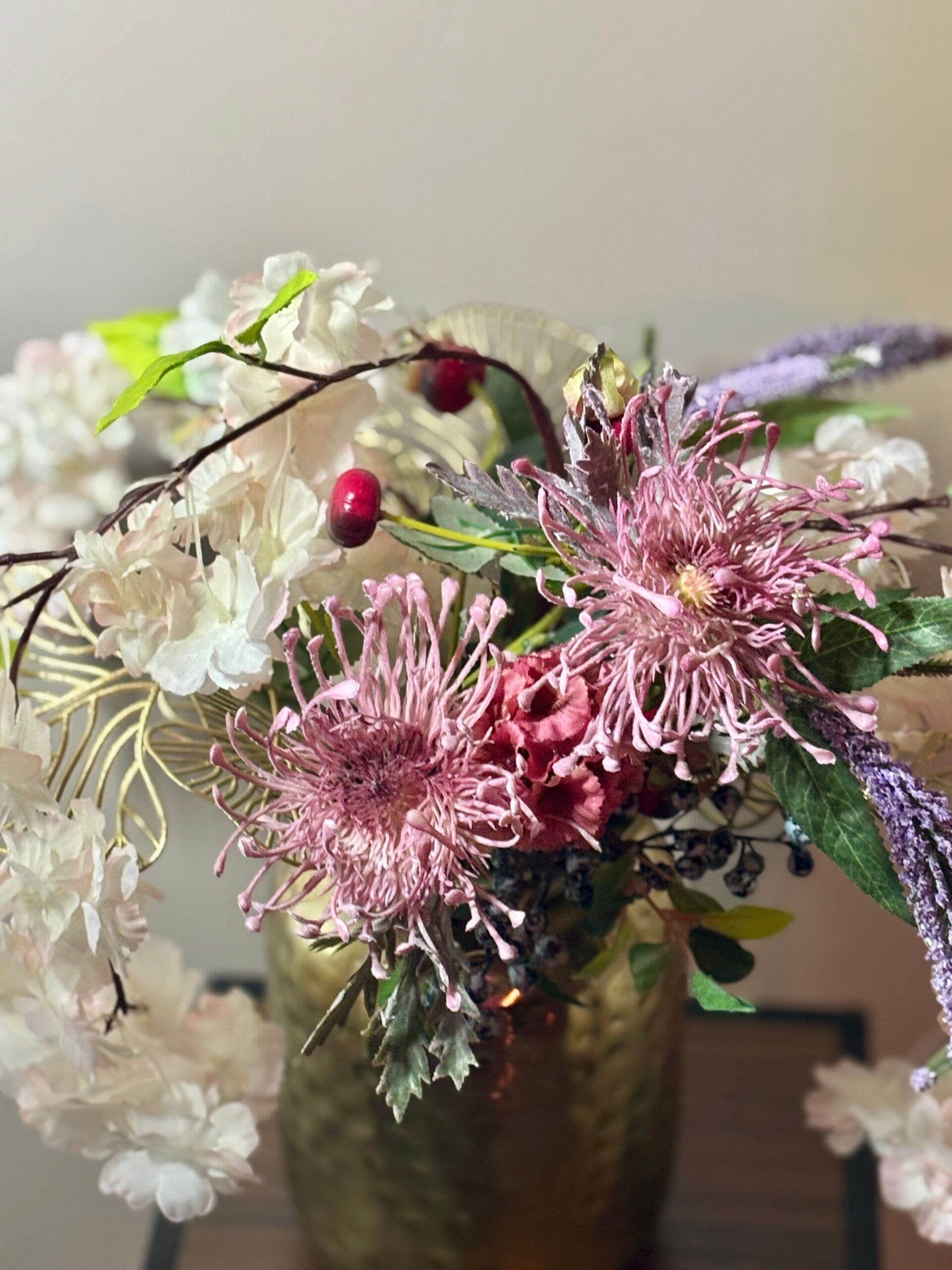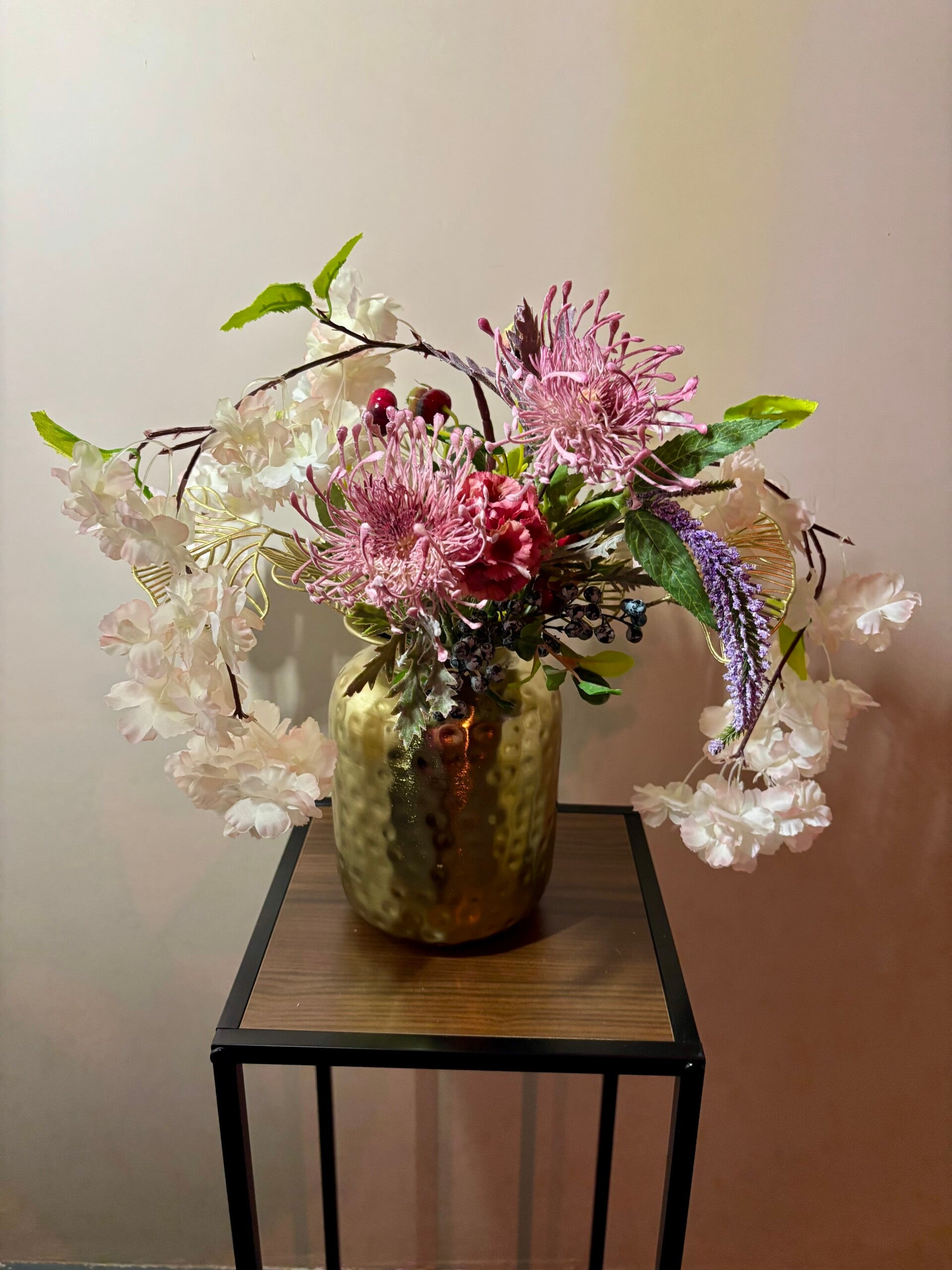 Boeket Elegant Charm is een stijlvol, opvallend boeket in een goudkleurige vaas, samengesteld in zachte tinten het boeket is een sfeervolle eyecatcher voor elk interieur.