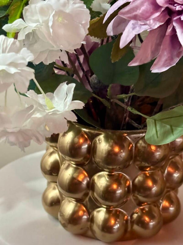 Het boeket staat in een lage goudkleurige bollen vaas van: 13cm. Hoog en 15cm. Breed.