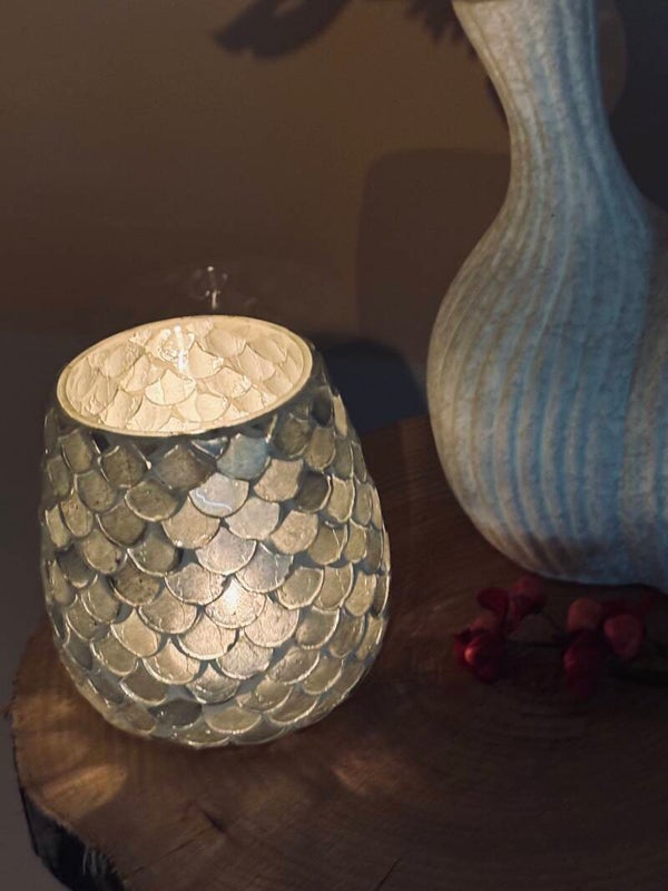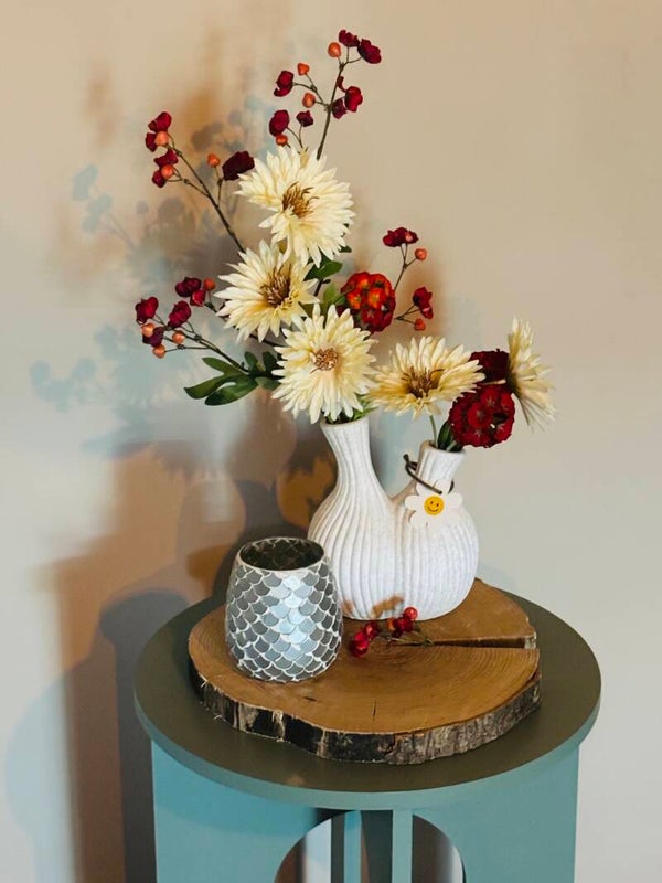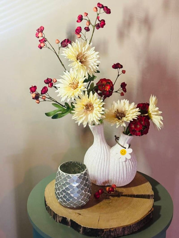 Deze zorgvuldig samengestelde set bestaat uit een dubbele toeter vaas met zijdezachte bloemen, een glazen waxinehouder met luxe patroon en een natuurlijke boomstamschijf als basis. De combinatie van warme tinten en subtiel licht creëert een tijdloze, sfeervolle uitstraling — perfect voor elk interieur.