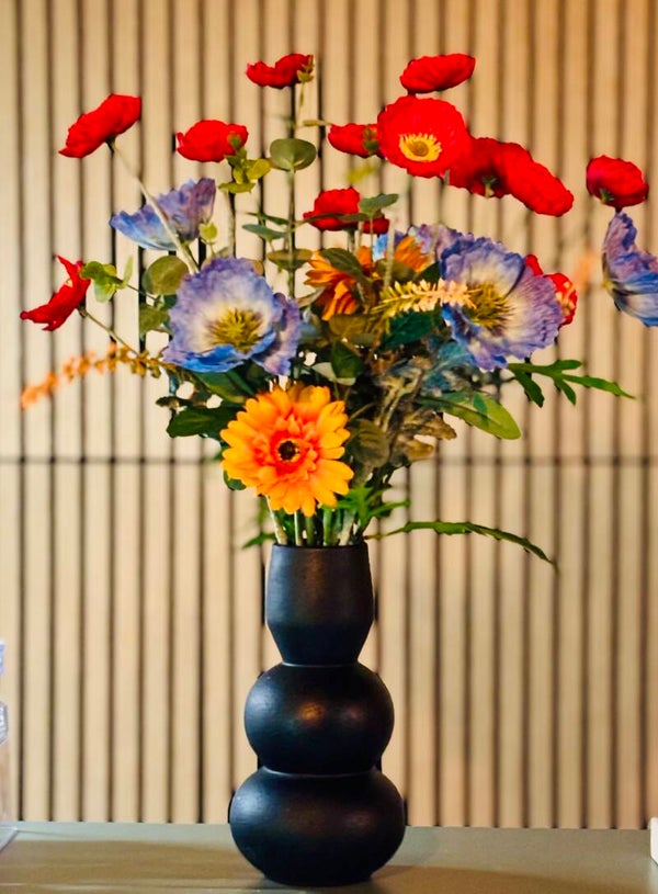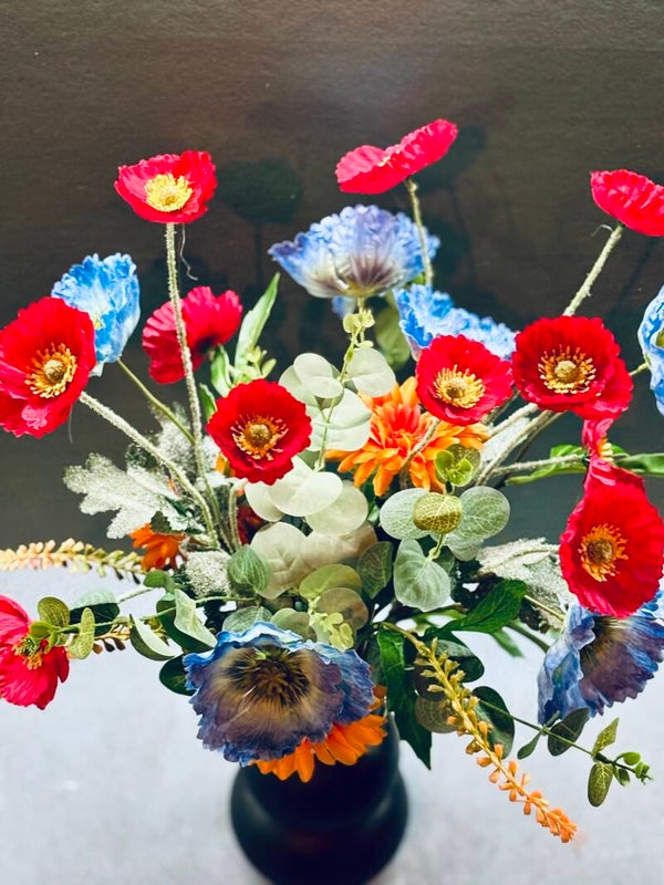 Een krachtig statement in een stijlvolle zwarte vaas. Fire & Frost combineert vurige rood- en oranje tinten met koele blauwe accenten — een unieke mix die direct opvalt. Dit boeket straalt energie, contrast en klasse uit, en brengt elk interieur tot leven met zijn kleurrijke balans tussen warmte en frisheid.