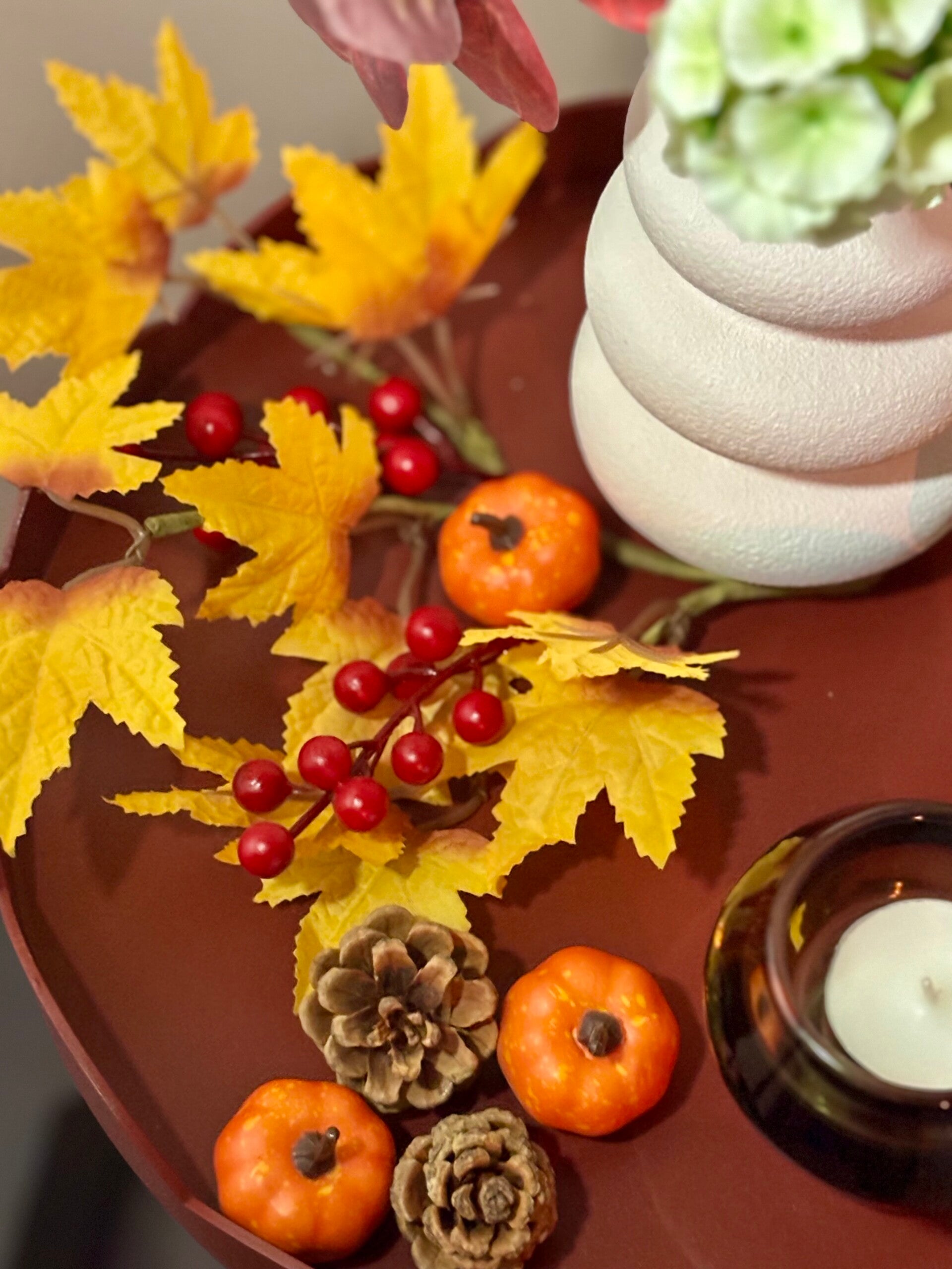 - Herfst decoratie / bladeren, rode bessen, pompoentjes en dennenappels