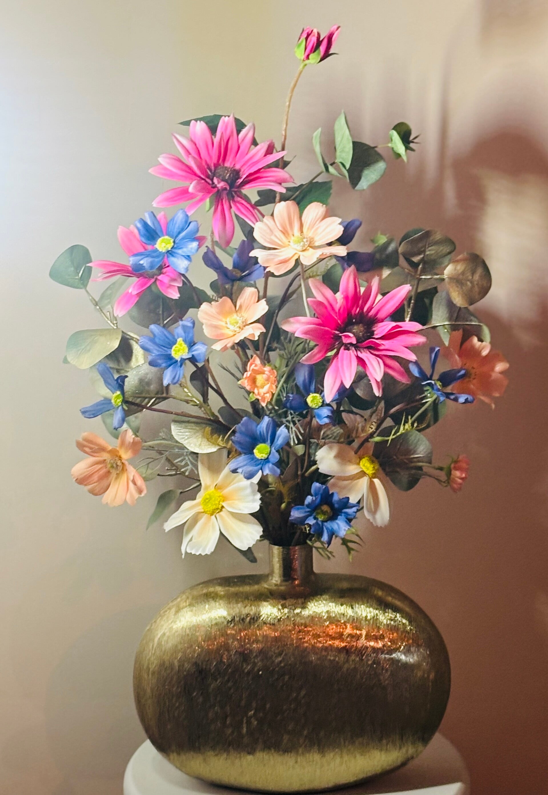 Geconbineerd met de goudkleurige vaas is dit boeket een echte eyecatcher!