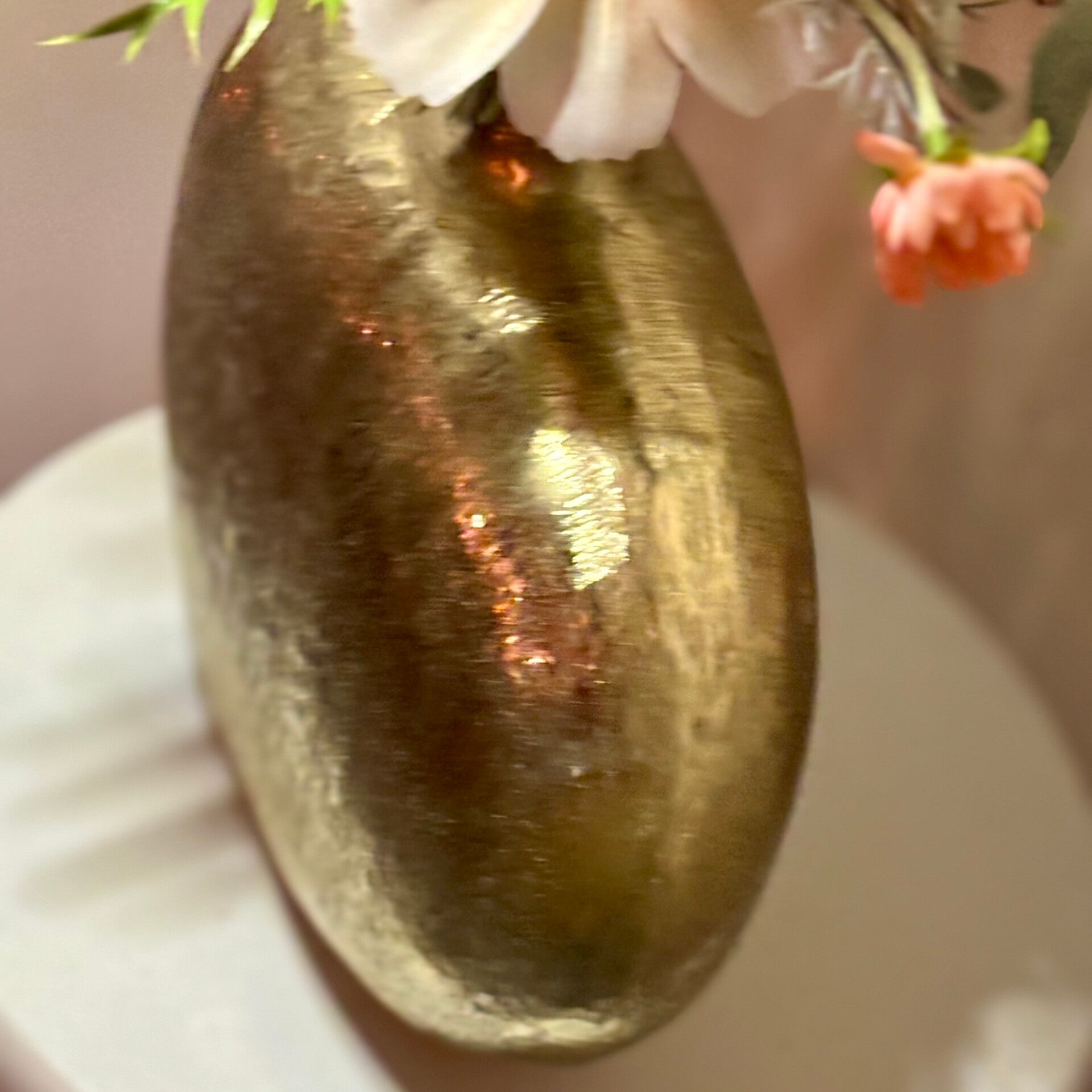 Het boeket staat in een goudkleurige plat / ovale vaas