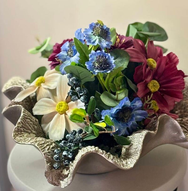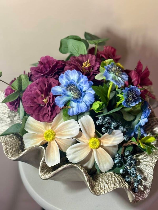 De mooie zware champagne kleurige decoratieve schaal is opgemaakt met bloemen in de kleuren: Blauw, Wit, Bordeux & Aubergine aangevuld met groene takjes.