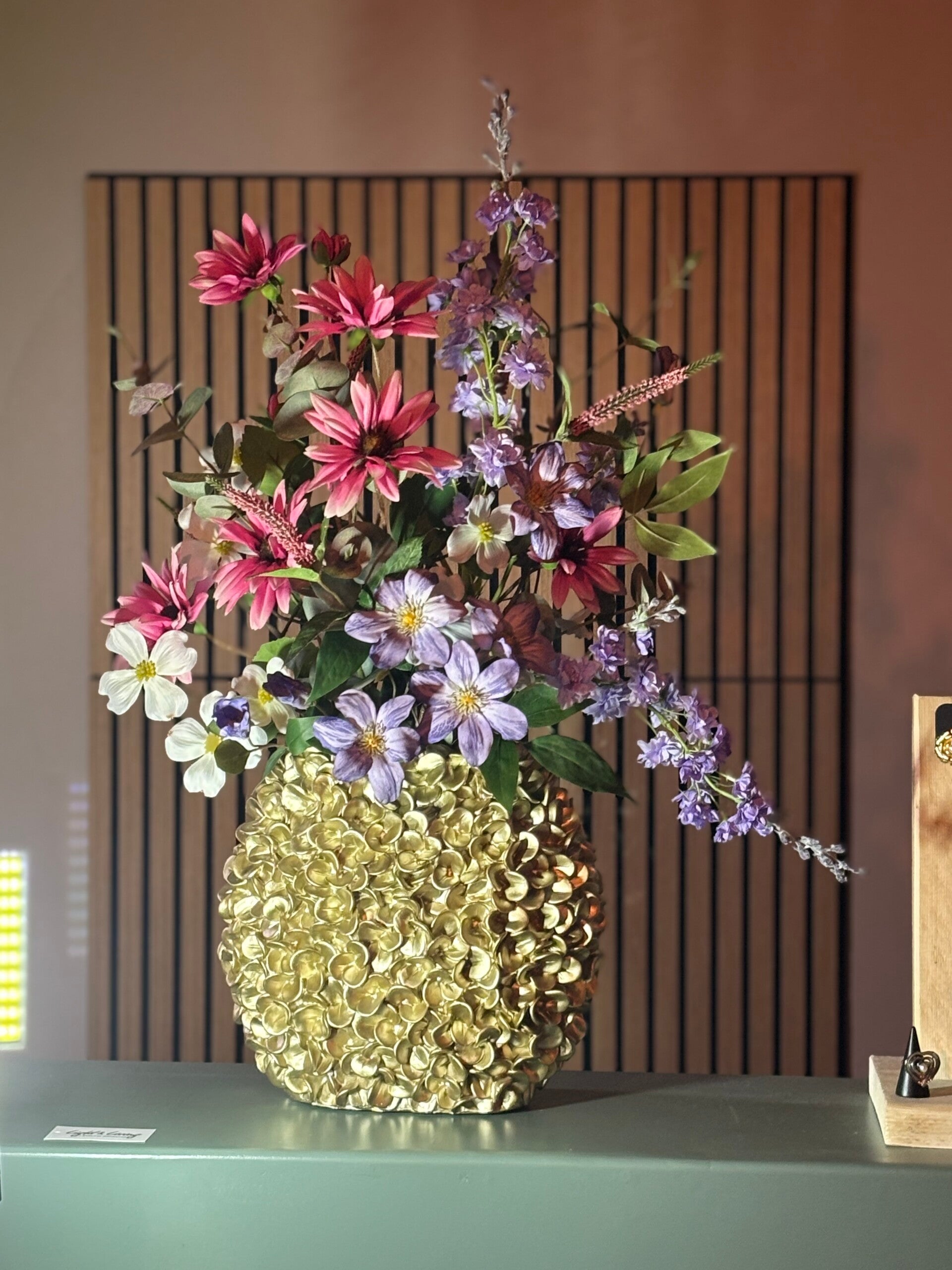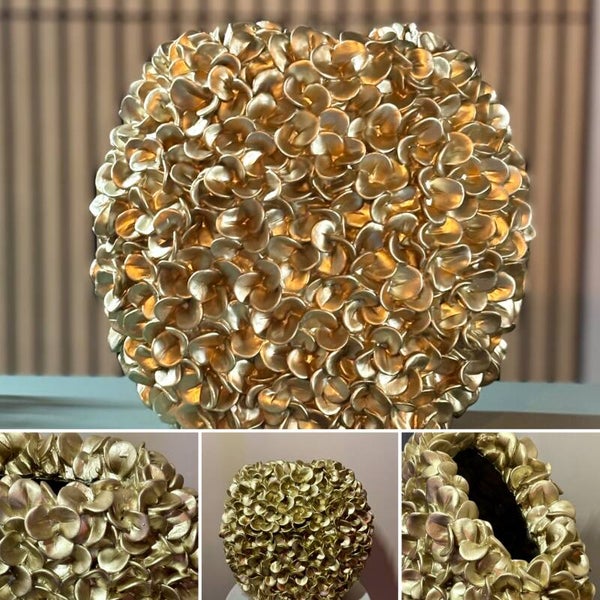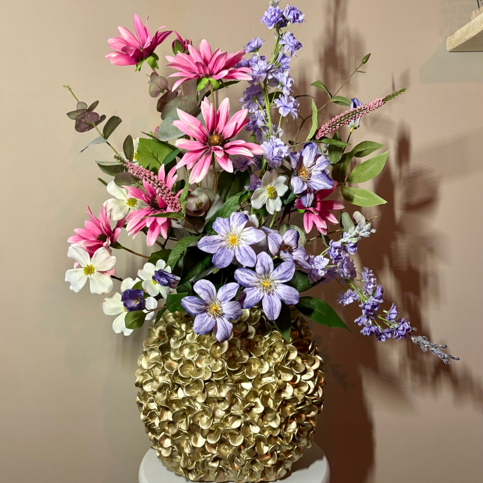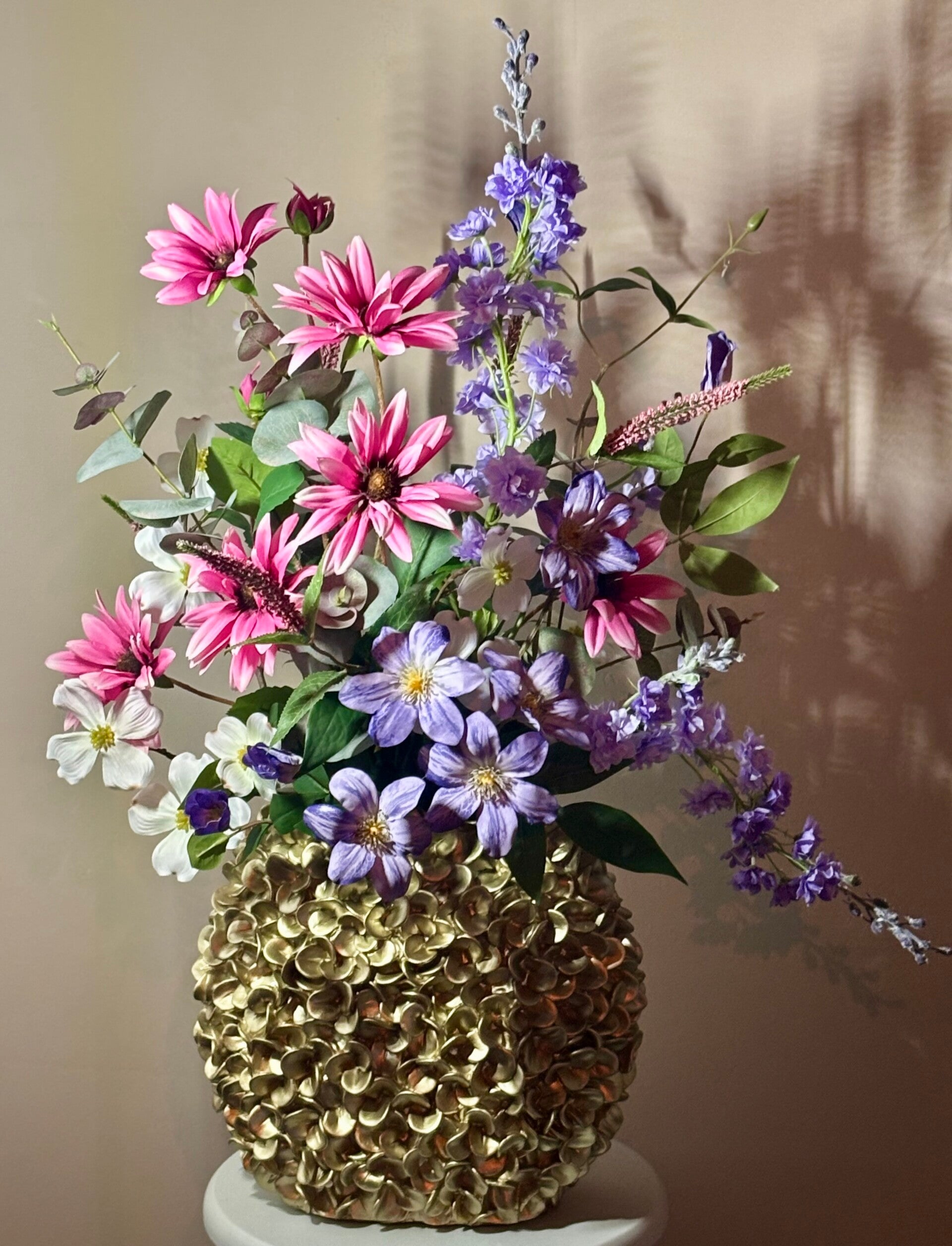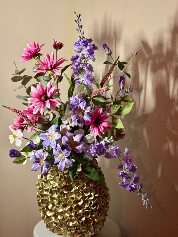 Het Phylia Charm boeket is met zorg samengesteld in de gouden Light & Living vaas Phylia (31,5 cm) – een stijlvol designstuk op zich. De rijke combinatie van real-touch bloemen in zachte roze, lila en frisse accenten zorgt voor een luxe uitstraling die in elk interieur tot zijn recht komt.