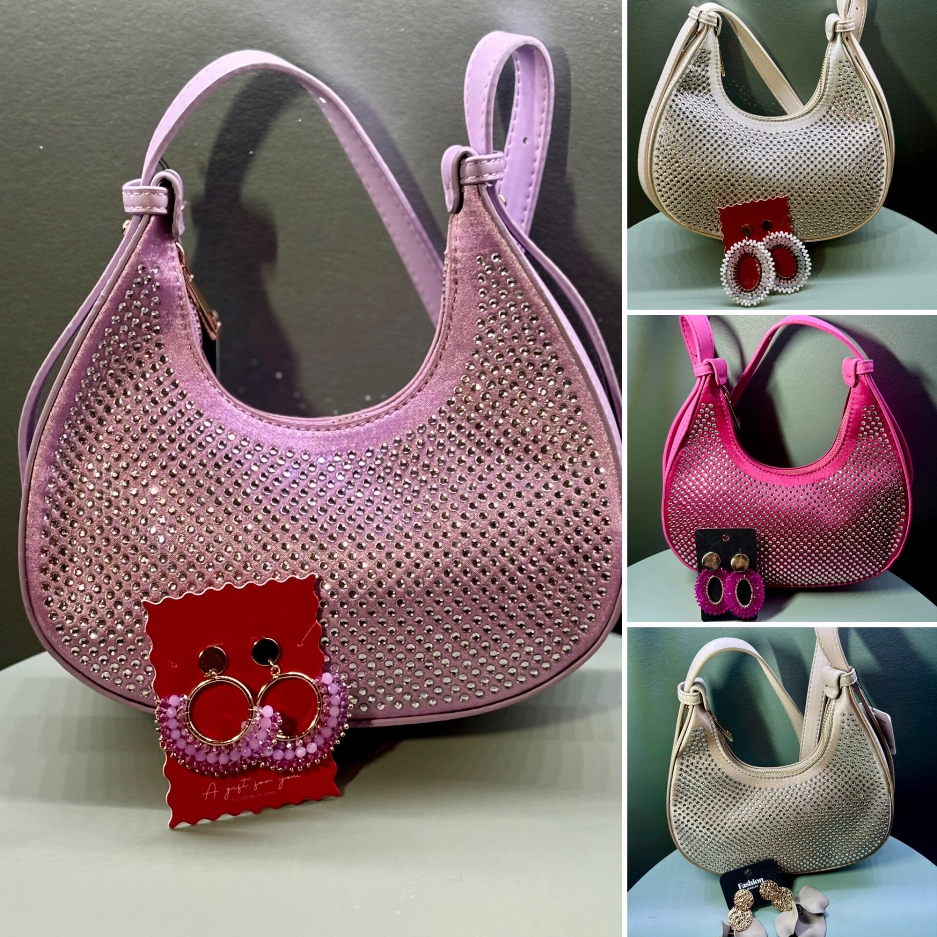 Dit Set bestaat uit: een glitter / Strass croissant tas in de kleur Lila met daarbij bijpassende oorbellen met kristal kralen in de kleur Lila / goud