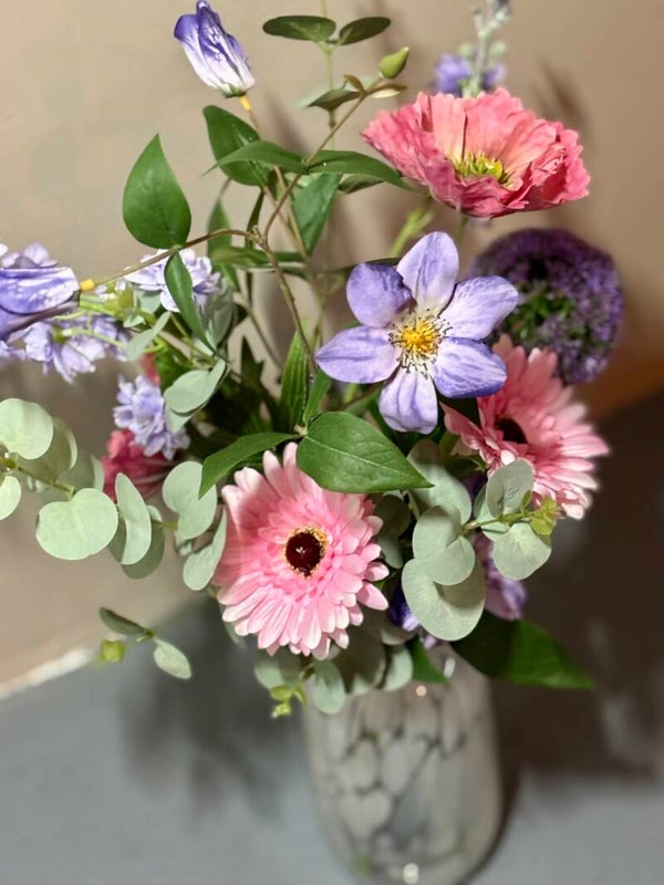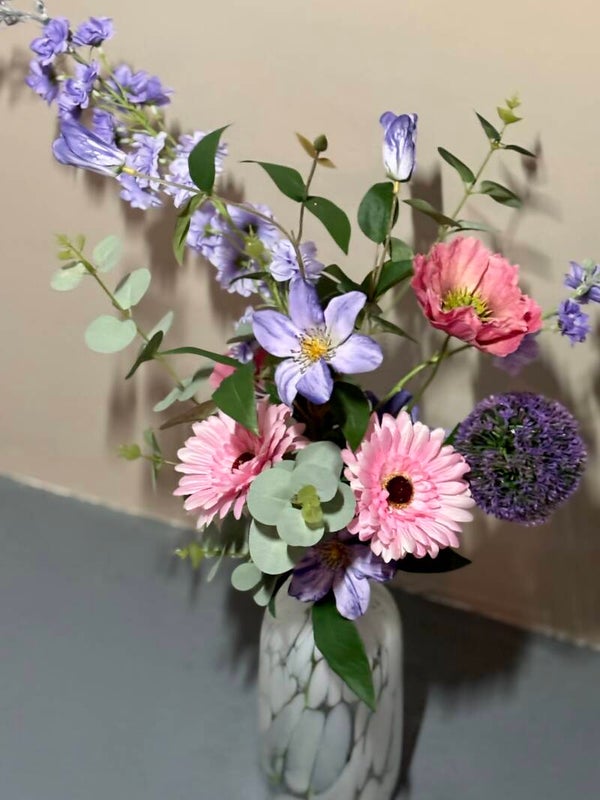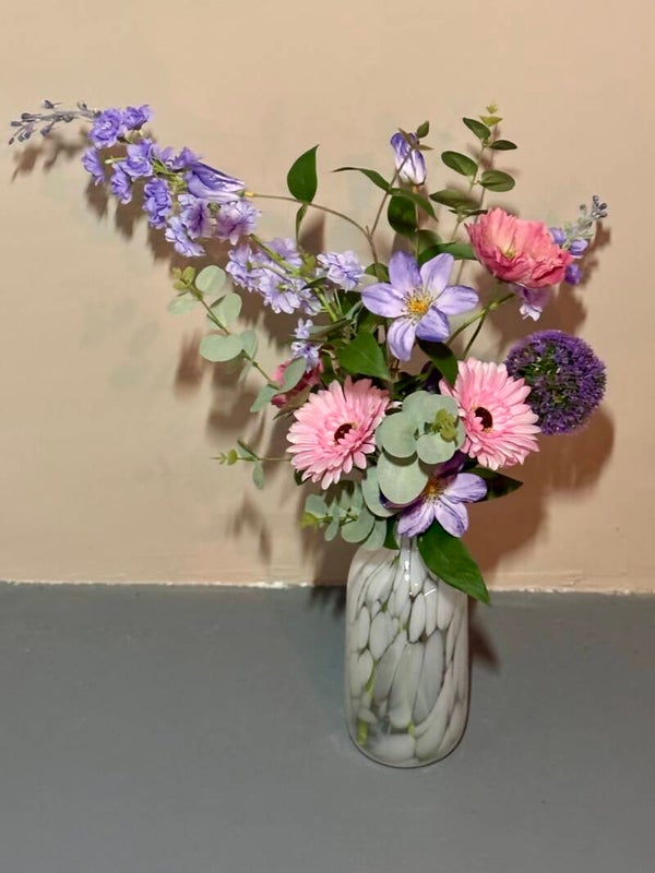 Het boeket staat in een vaas van glas met een witte "wolk" print.
