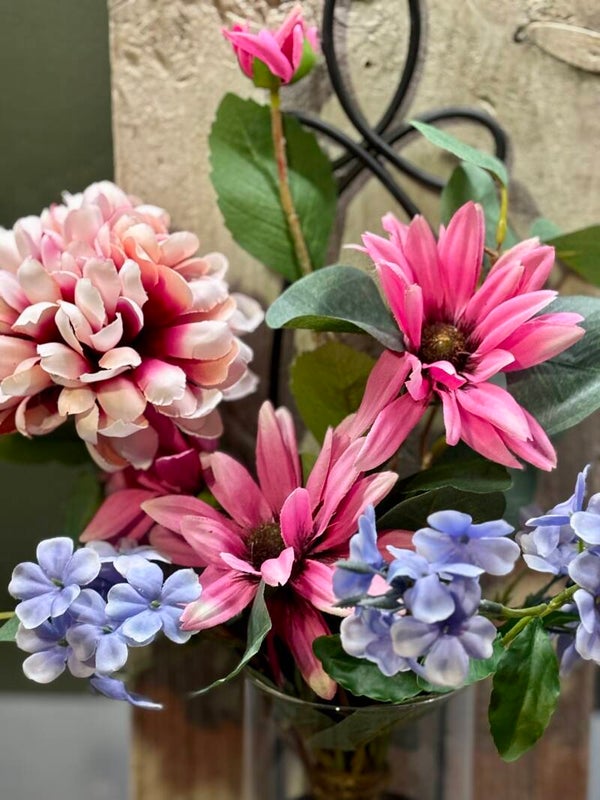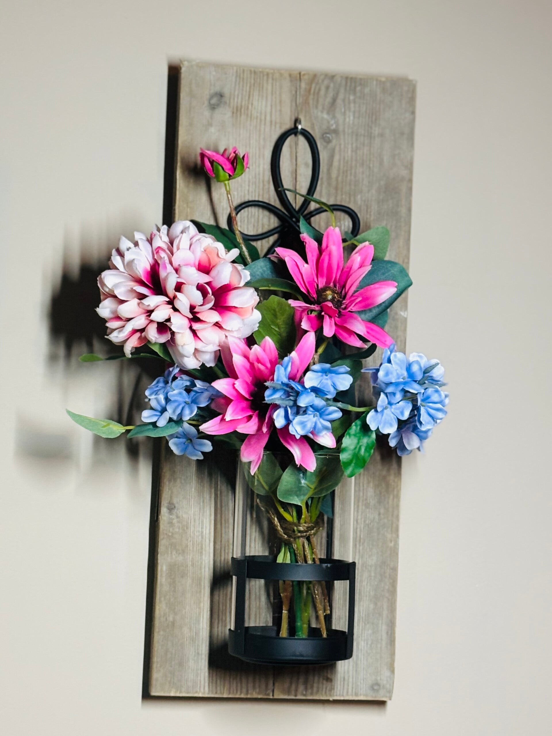 Een vaas of halve vaas met kunstbloemen op "oud" steigerhout πͺπͺ΅