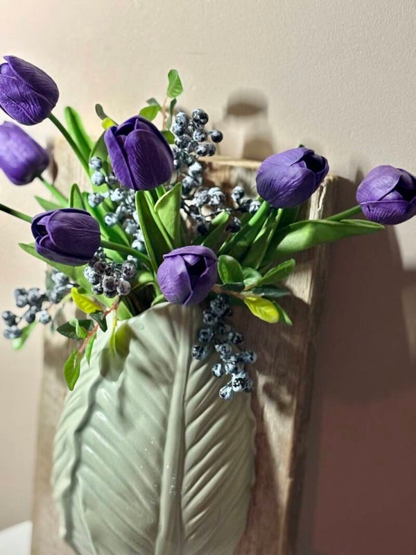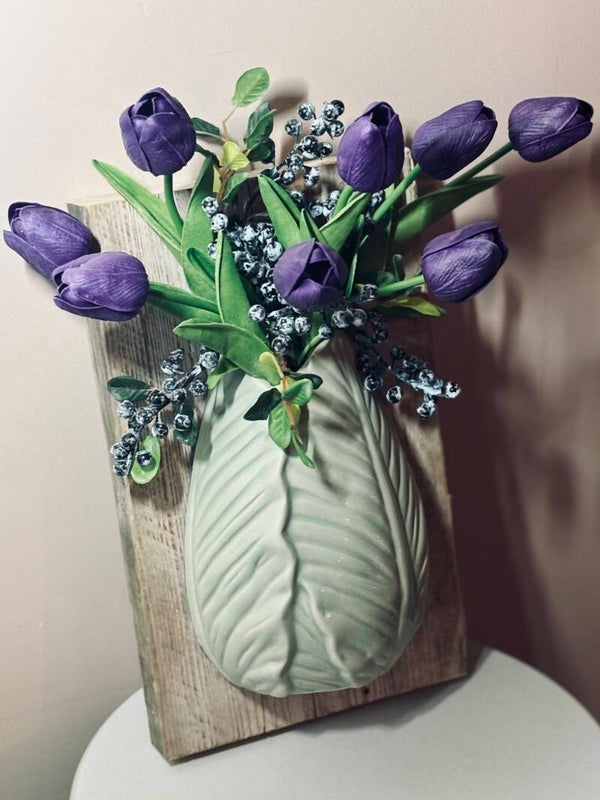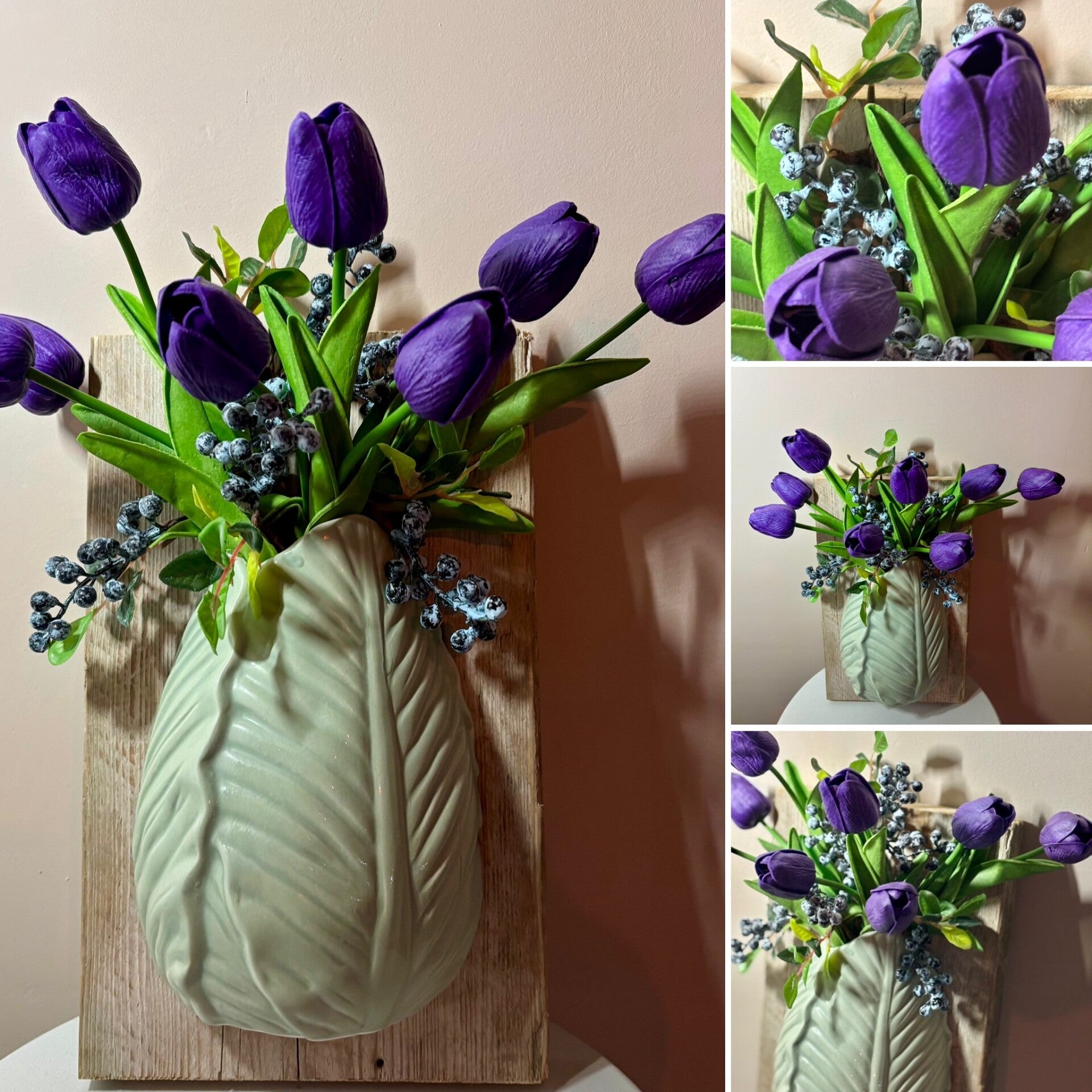 Wall of Charm | steigerhouten wandbord met halve vaas bloemen | paarse tulpen