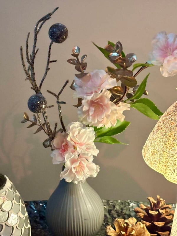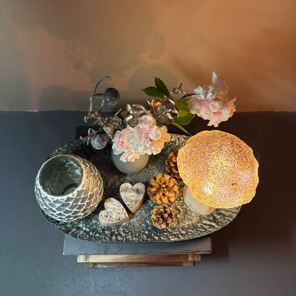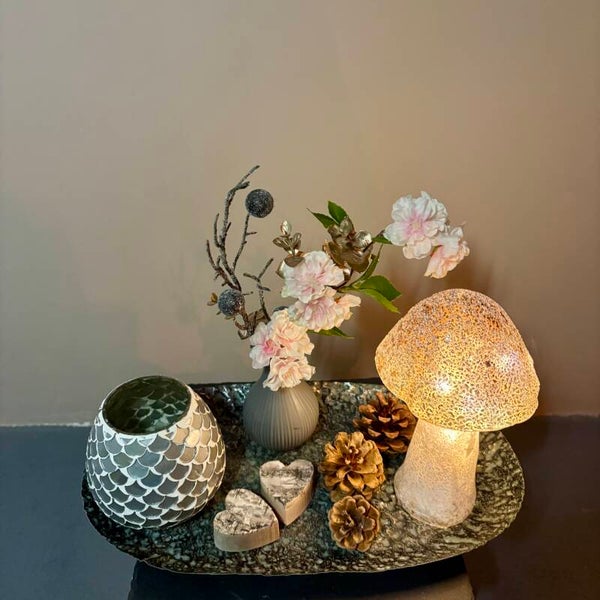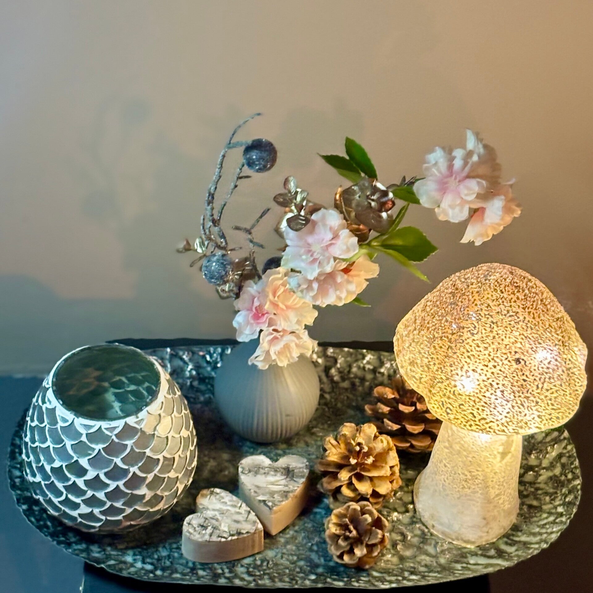 metalen plateau | waxinehouder (spiegel effect) | paddestoel met lampjes | vaasje met bloemen | losse deco