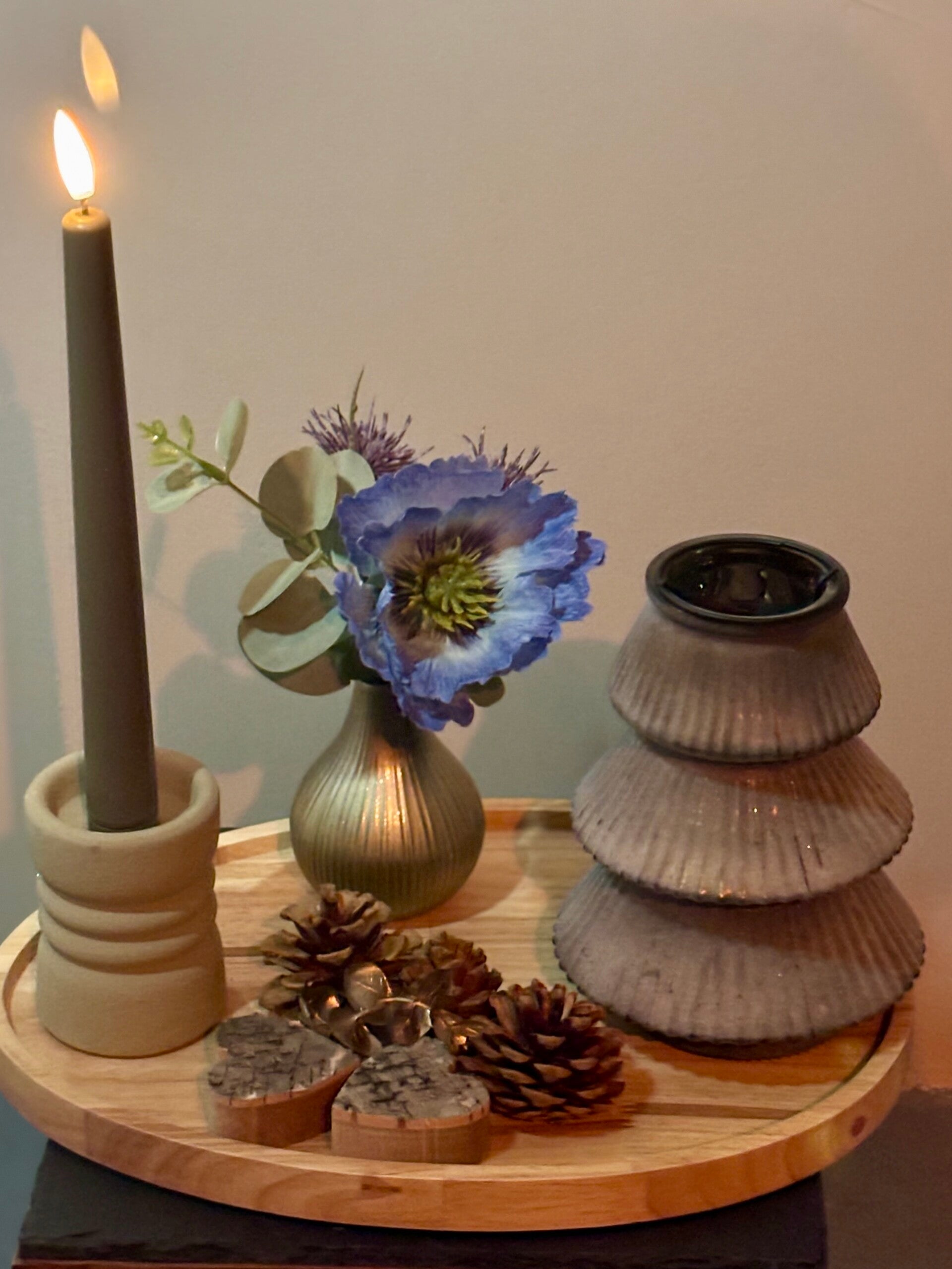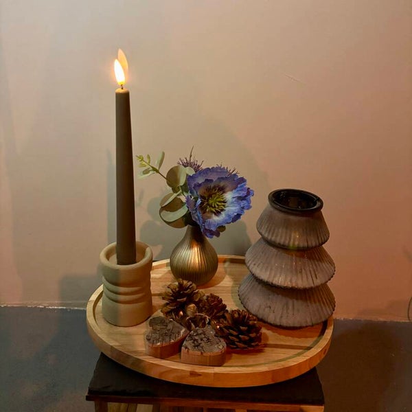 Houten plateau | kerstboom waxine houder | kandelaar met led kaars | vaasje met bloemen | losse deco
