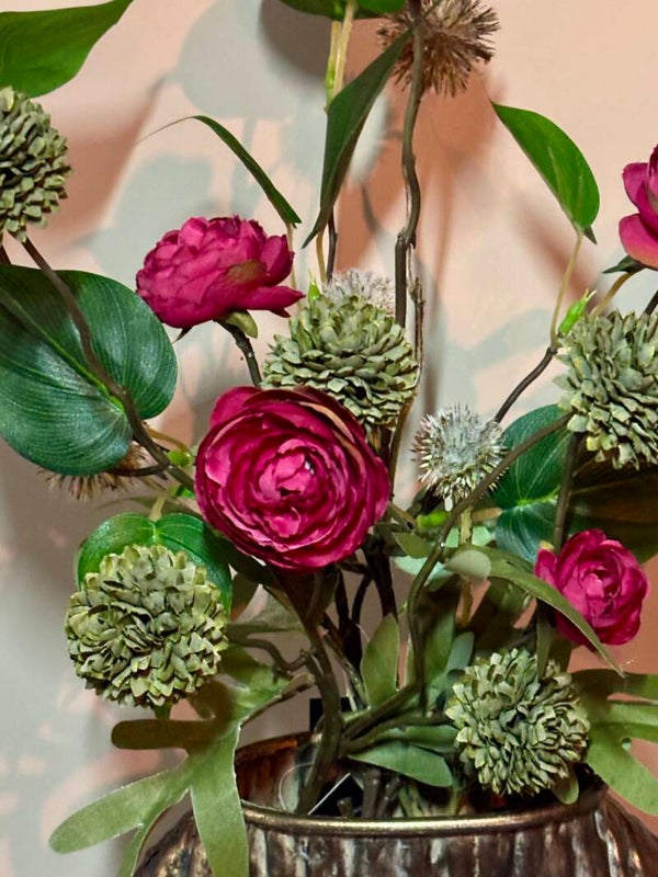 Een compact maar krachtig boeket met diepe framboos kleurige bloemen en contrasterende groene accenten. Dit arrangement is ideaal voor kleinere ruimtes, zoals een bijzettafel, plank of vensterbank, maar heeft toch een luxe uitstraling dankzij de donkere vaas en rijke kleuren.