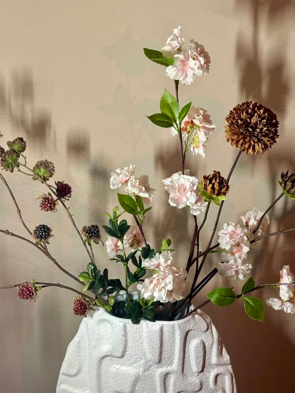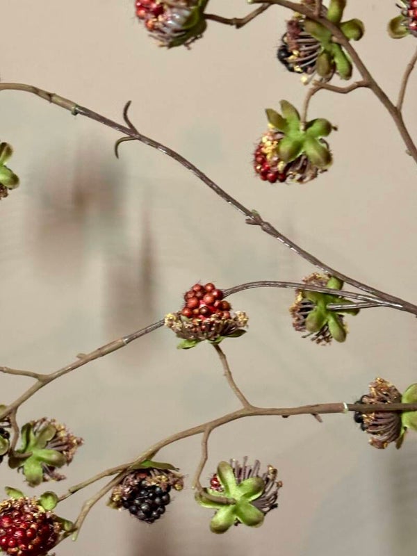 Een verfijnd en rustig boeket met zachte wit/peach blushbloesems, gecombineerd met lange pompom takken "coffee" en een grote natuurlijke bramen tak met rood-zwarte realistische bramen.