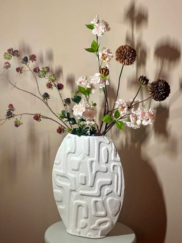 De mat witte vaas met reliefstructuur geeft dit arrangement een moderne, serene uitstraling.