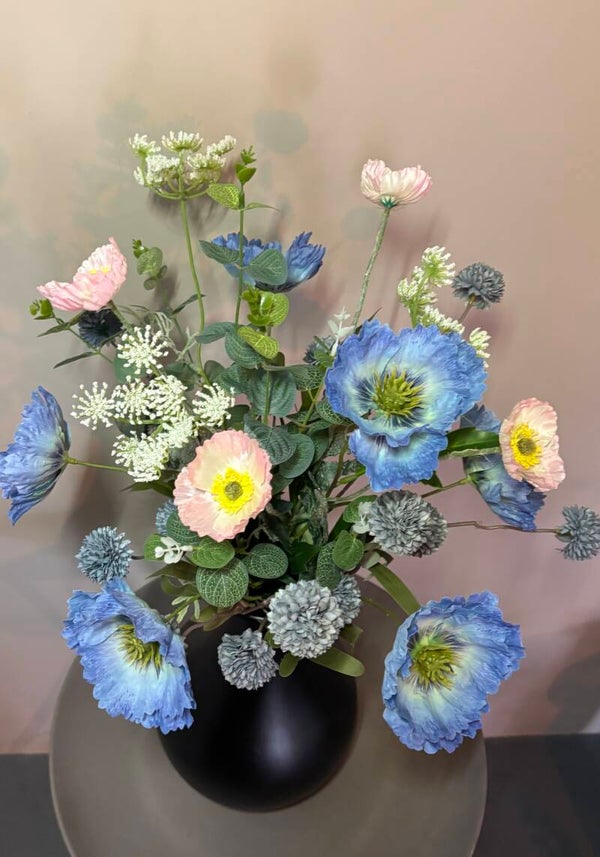 De matte zwarte vaas geeft het geheel een chique en tijdloze uitstraling en maakt dit arrangement perfect voor een modern interieur.